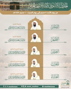 أوضحت رئاسة الشؤون الدينية بالمسجد الحرام والمسجد النبوي عن جدول الأئمة المكلفين بإمامة الصلوات للفترة من يوم غد الأحد 4 محرم حتى يوم السبت القادم 10 محرم 1447هـ، وذلك في إطار تنظيم شؤون الإمامة وتوفير أجواء روحانية تامة للمصلين والزوار.