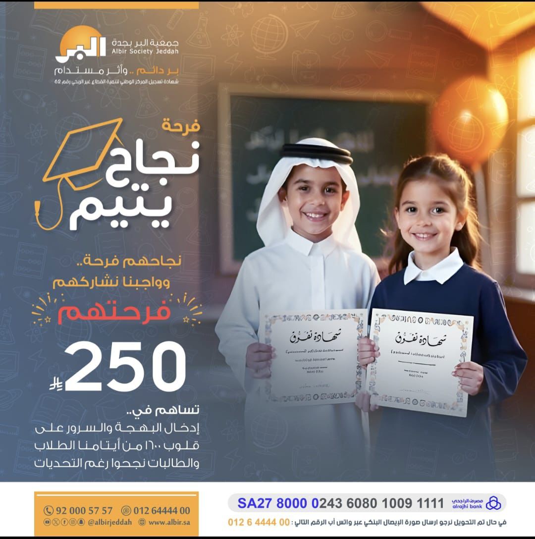 نفذت جمعية البر بجدة مبادرة للأيتام تحت عنوان: “فرحة نجاح يتيم” بهدف رسمة البسمة على وجوههم، وغرس البهجة في قلوبهم، وإعلاء قيمة التحصيل العلمي في وعيهم، ومشاركتهم فرحة نجاحهم من خلال مكافاتهم على اجتهادهم وتحقيقهم النجاح في مسيرتهم التعليمية، بما يعزز شعورهم بالمساواة مع أقرانهم غير الأيتام، وليكون ذلك حافزاً لهم باعتبارهم جزءاً أصيلاً من البناء المجتمعي.