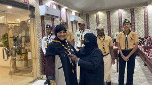 قلّدت القائدة الكشفية روضة علي الهوساوي منديل فريق كشافة شباب مكة المكرمة ، للدكتورة كتورة عفاف محمد الحربي، المدير التنفيذي لفرع جمعية مراكز الأحياء بالعاصمة المقدسة، وذلك خلال الحفل السنوي الذي أقامه فريق الكشافة لتكريم أمهات الكشافين المتميزين والمتفوقين كشفيًا وعلميًا وعمليًا، وذلك بمقر الديوانية حيث أقيم حفل خطابي قدّمه الكشاف إبراهيم سليمان أبكر، وبدء بتلاوة من القرآن الكريم تلاها الشبل إياد حسن شيت، ثم كلمة ترحيبية ألقاها الشبل سهيل أحمد الشنقيطي، رحّب فيها بالدكتورة عفاف الحربي ، وأمهات الكشافين، والقيادات، والمرشدات، والمستشارات ،بعد ذلك، قُدّمت فقرة “قصة من نحن” من قِبل الكشاف عمر أحمد الشنقيطي، ثم ألقى الشبل إياد حسن شيت كلمة عن دور الأمهات والمرشدات في الفريق النسائي بكشافة شباب مكة.