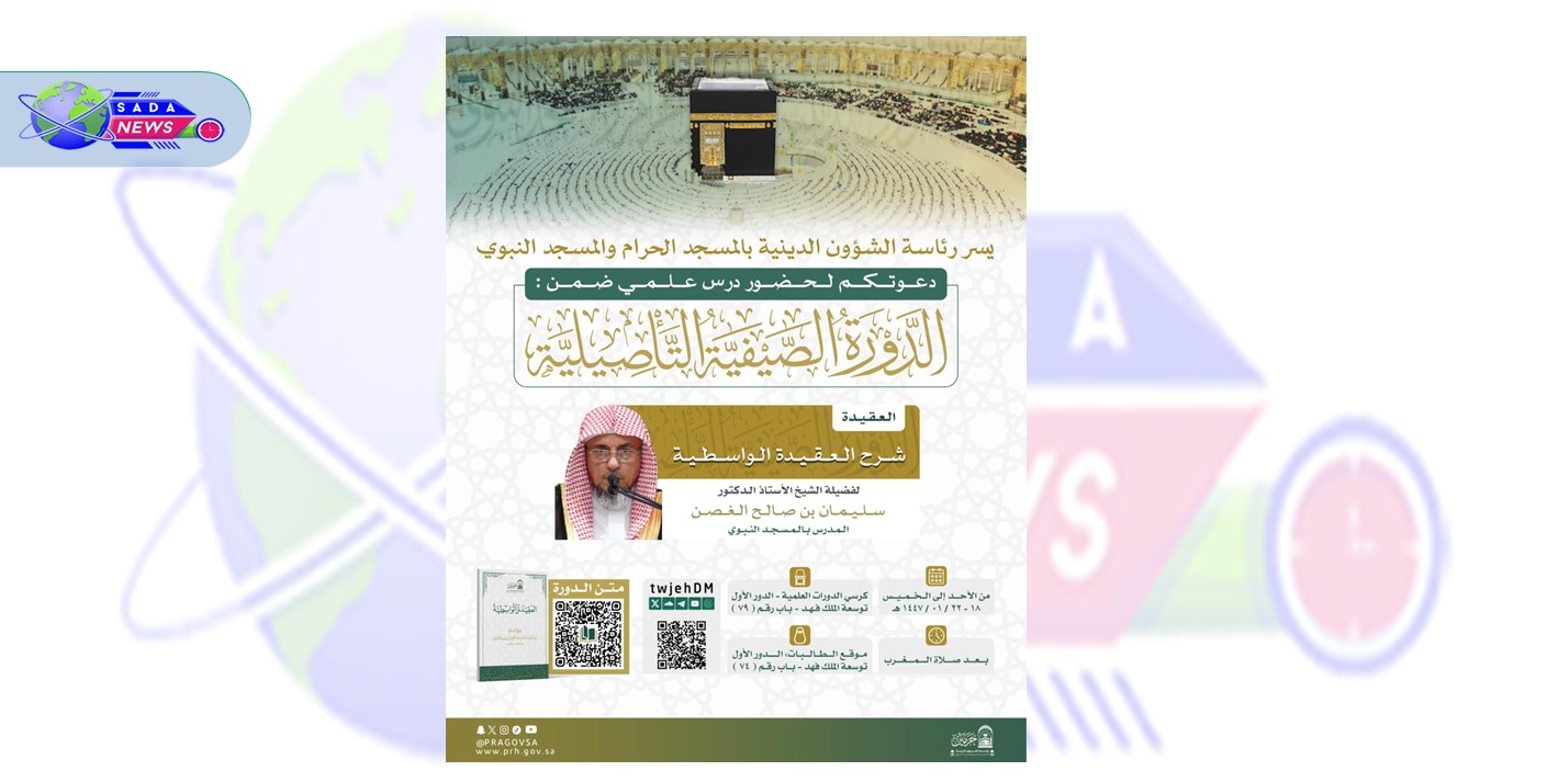 تنظم رئاسة الشؤون الدينية بالمسجد الحرام والمسجد النبوي درس علمي بعنوان: “شرح العقيدة الواسطية” ضمن الدورة الصيفية التأصيلية في المسجد الحرام والذي يُقدّمه فضيلة الشيخ الأستاذ الدكتور سليمان الغصن