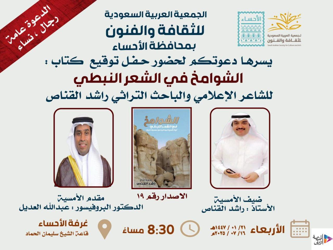 يوقّع الشاعر والإعلامي والباحث في التراث، راشد القناص، كتابه الجديد “الشوامخ في الشعر النبطي” مساء يوم الأربعاء 21 محرم 1447هـ، الموافق 16 يوليو 2025م، في تمام الساعة 8:30 مساءً، وذلك في قاعة الشيخ سليمان الحماد بغرفة الأحساء.
