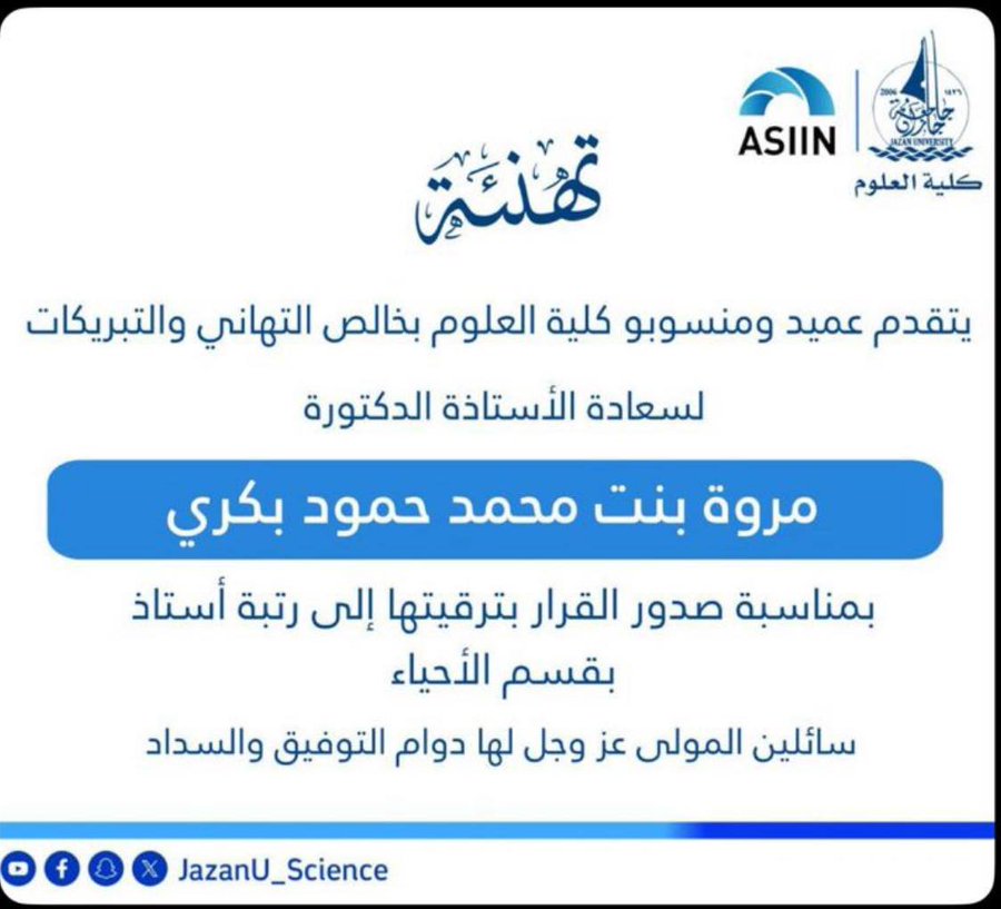 ألف مبارك يا دكتورتنا الفاضلة، نسأل الله أن يجعل ترقيتك رفعة في الدارين، وأن ينفع بكِ الدين والوطن، ويزيدكِ توفيقًا وتميزًا.