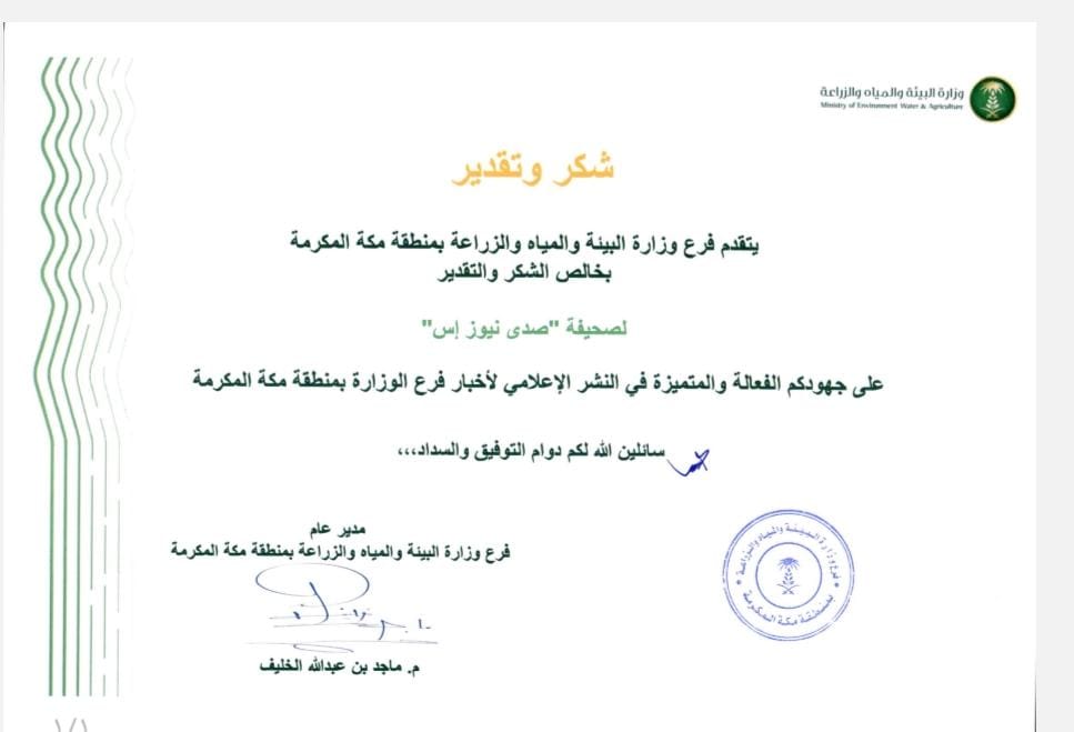 كرم فرع وزارة البيئة والمياه والزراعة بمنطقة مكة المكرمة صحيفة صدى نيوز إس – وثمن جهودها الإعلامية الفعالة والمتميزة في النشر الإعلامي لأخبار فرع الوزارة بمنطقة مكة المكرمة