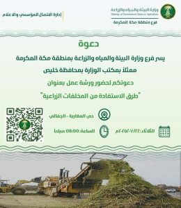 نفّذ مكتب وزارة البيئة والمياه والزراعة بمحافظة خليص، ممثلاً في قسم الزراعة، ورشة عمل توعوية بعنوان “طرق الاستفادة من المخلفات الزراعية”، وذلك في مزرعة Power of Worms، بحضور عدد من المزارعين والمهتمين بالشأن البيئي والزراعي.