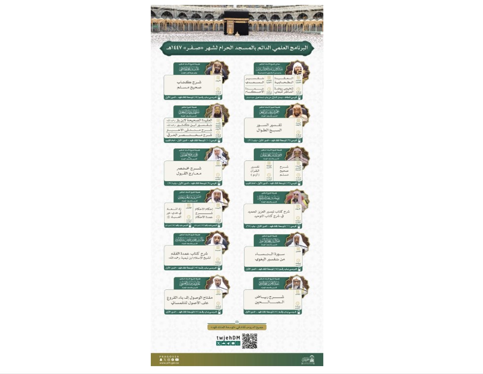 أصدرت رئاسة الشؤون الدينية بالمسجد الحرام والمسجد النبوي جدول البرنامج العلمي الدائم في المسجد الحرام، لشهر صفر من العام 1447هـ، وذلك استمرارًا في تعزيز الحضور العلمي والدعوي في أروقة الحرم المكي الشريف.