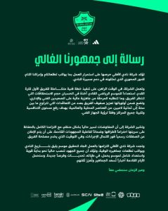 واختُتم البيان بالتأكيد على أن الأيام القادمة ستحمل أخبارًا تُسعد الجماهير وتعزّز ثقتهم بالنادي، تحت شعار: “وعبر الزمان سنمضي معًا”.