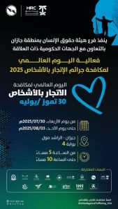 ينظم فرع هيئة حقوق الإنسان بمنطقة جازان غدًا الأربعاء، الموافق 30 يوليو 2025، فعالية خاصة بمناسبة اليوم العالمي لمكافحة جرائم الاتجار بالأشخاص 2025. تقام الفعالية بالتعاون مع الجهات الحكومية ذات العلاقة، وذلك في مجمع راشد مول بالمنطقة.