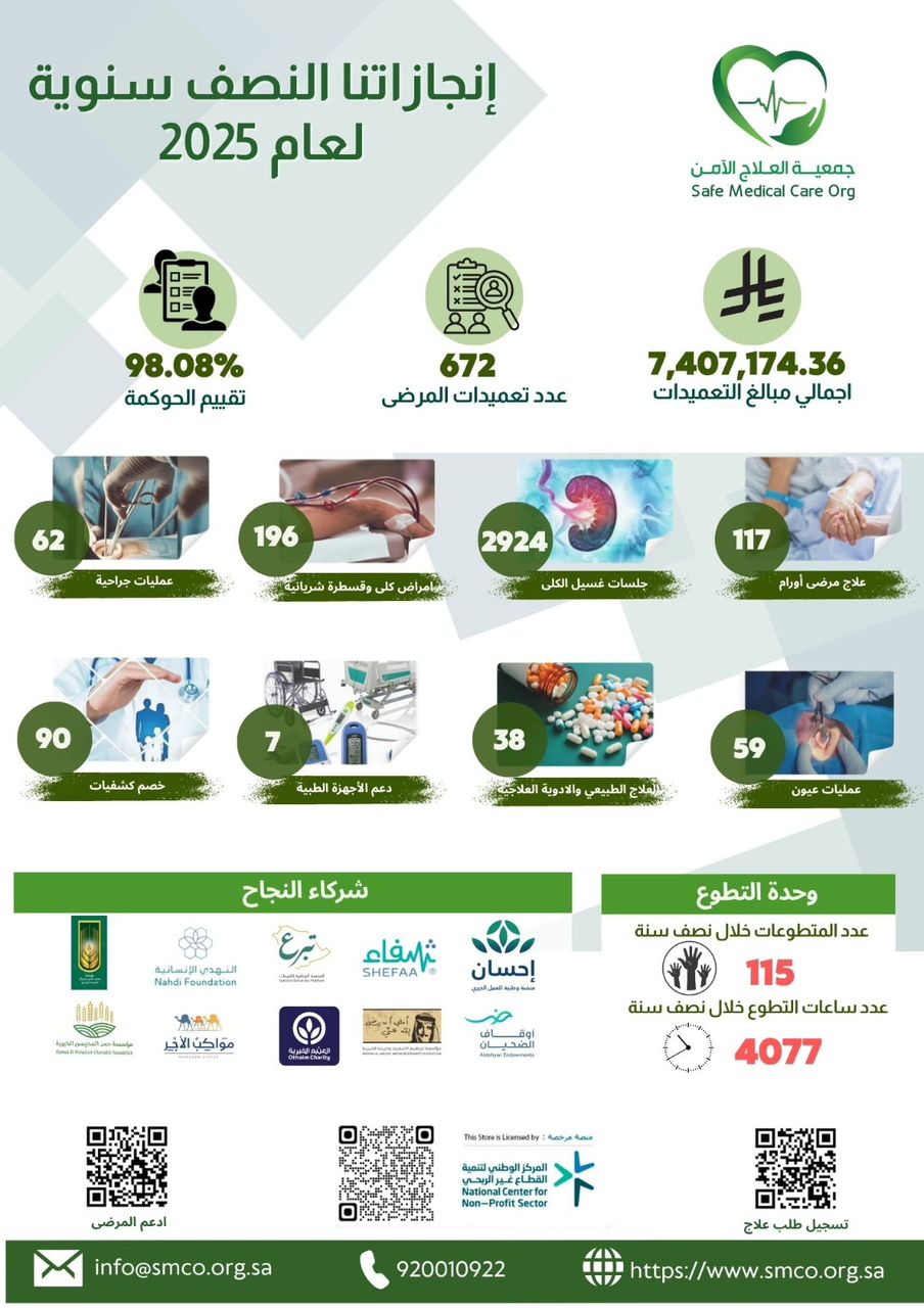 أصدرت جمعية ” العلاج الآمن ” في جدة تقرير إنجازاتها للنصف الأول من عام 2025 ، إذ تضمن عددًا من الأهداف الاستراتيجية التي نفذتها الجمعية، بالإضافة إلى المبادرات والإنجازات التي حققتها، والتي تتعلق بجهودها الخيرية والإنسانية للإسهام في تأمين الخدمات العلاجية للحالات غير المقتدرة، عبر الشراكة مع الجهات ذات العلاقة وفاعلى الخير .