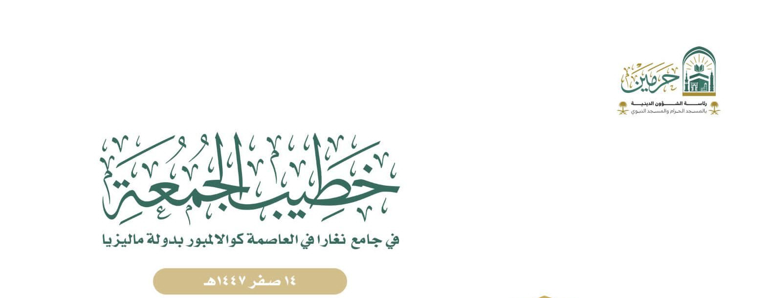 يُؤمّ فضيلة الشيخ الدكتور صلاح بن محمد البدير، إمام وخطيب المسجد النبوي الشريف، جموع المصلين اليوم الجمعة في جامع نغارا بالعاصمة الماليزية كوالالمبور، حيث يُلقي خطبة الجمعة، وذلك في إطار زيارته الحالية إلى ماليزيا.