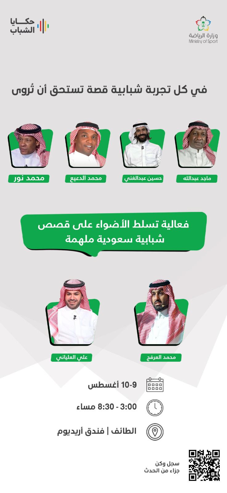 تستكمل يوم غدٍ الأحد 10 أغسطس 2025م، فعاليات برنامج “حكايا الشباب” في مرحلته الثالثة، والذي يستمر لمدة يومين في فندق إريديوم بمحافظة الطائف، ويتضمن إقامة جلسات حوارية ثرية ومتنوعة، يشارك فيها عدد من الأكاديميين والرياضيين البارزين، وذلك ضمن مبادرات وزارة الرياضة، ممثلة في الإدارة العامة للأنشطة الشبابية.