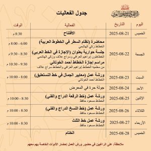 هذا ويهدف الملتقى الذي أستمر لمدة (8) أيام إلى إبراز جماليات هذا الفن العريق، والتعريف بمدارسه وأساليبه المختلفة، ودعم الخطاطين والفنانين، ونشر ثقافة الخط العربي في الأوساط المحلية والعالمية.