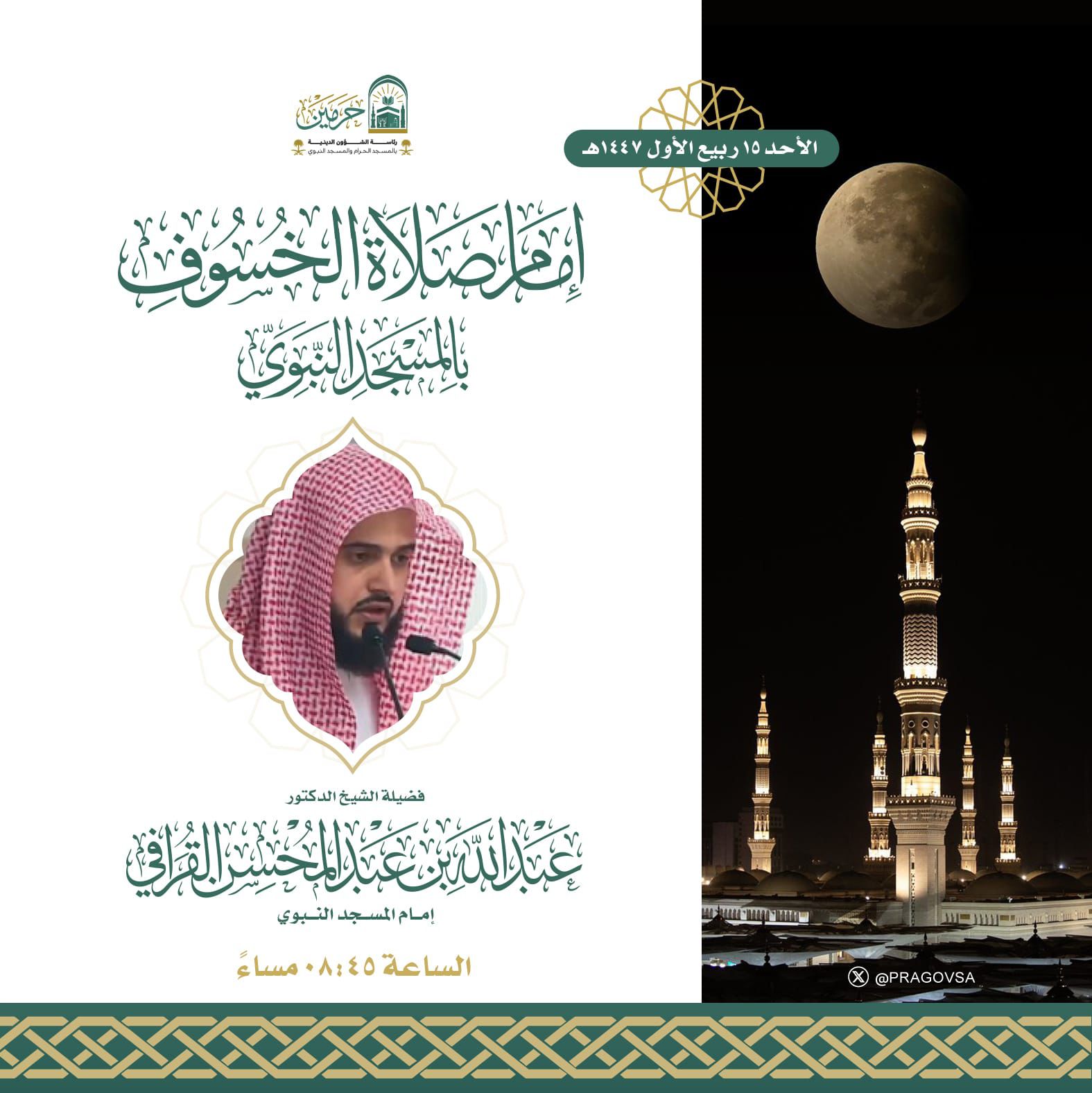 أوضحت رئاسة الشؤون الدينية بالمسجد الحرام والمسجد النبوي أن فضيلة الشيخ الدكتور عبدالله القرافي –حفظه الله– سيتولى إمامة المصلين في صلاة خسوف القمر بالمسجد النبوي، وذلك يوم الأحد 15 ربيع الأول 1447هـ الموافق 06 سبتمبر 2025م.