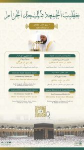 وسيتولى فضيلة الشيخ الدكتور ماهر بن حمد المعيقلي إمامة المصلين وإلقاء خطبة الجمعة في المسجد الحرام.