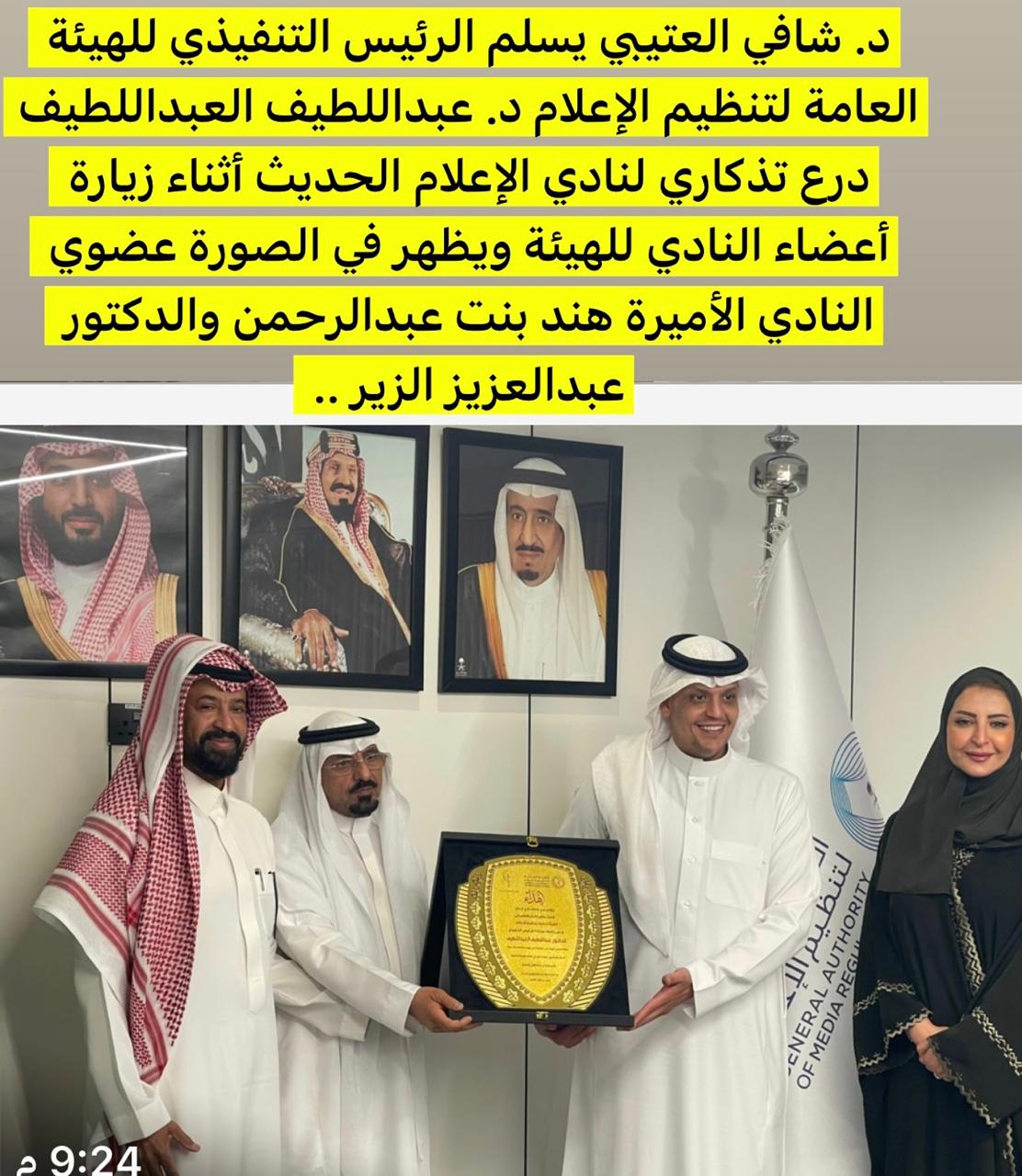زار وفد من نادي الإعلام الحديث، يتقدمه رئيس النادي الدكتور شافي العتيبي، وعدد من الأعضاء البارزين، مقر الهيئة العامة لتنظيم الإعلام، في إطار تعزيز التواصل والتعاون بين الجانبين.