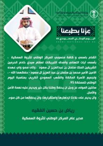 أن هذا الحدث الوطني يمثل أهمية خاصة لجميع السعوديين مشيراً إلى أن منظومة البيئة والمياه والزراعة تعمل على ترجمة مستهدفات رؤية المملكة 2030 من خلال مبادرات نوعية ومشاريع تنموية تحقق الاستدامة وتعزز جودة الحياة ، ورفع المهندس رياض الفقيه ، باسمه ونيابة عن منسوبي المركز ، التهاني والتبريكات لخادم الحرمين الشريفين الملك سلمان بن عبدالعزيز آل سعود، وسمو ولي عهده الأمين صاحب السمو الملكي الأمير محمد بن سلمان بن عبدالعزيز -حفظهما الله- والأمير خالد الفيصل مستشار خادم الحرمين الشريفين أمير منطقة مكة المكرمة، ونائبه الأمير سعود بن مشعل، وللشعب السعودي كافه بهذه المناسبة السعيدة.