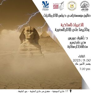 تنظم مؤسسة زاهي حواس للآثار والتراث يوم الثلاثاء الموافق 30 سبتمبر 2025 محاضرة علمية في قصر الأمير طاز بالقاهرة في تمام الساعة السابعة مساءً، بعنوان: “التغيرات المناخية وتأثيرها على الآثار المصرية”، يلقيها الدكتور أشرف يوسف عويس، مدير عام ترميم سقارة، والمحاضر الزائر السابق بجامعة كنساي اليابانية.