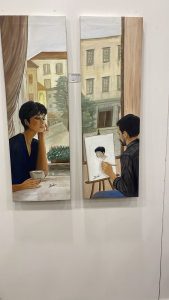 الفنانة بدور الشمري فنانة تشكيلية ترسم باللون الزيتي وهذه لوحتها المشاركة في المعرض أسمتها مسافة لوحة حيث تعبر اللوحة عن شعور اثنين هذا الرجل يرسم هذه البنت من خلال نافذة طبعا يعبر بمشاعره من خلال لوحة فأسمتها مسافة لوحة لان المسافة التي تفصلهم هي لوحة فهي في الجهة المقابلة