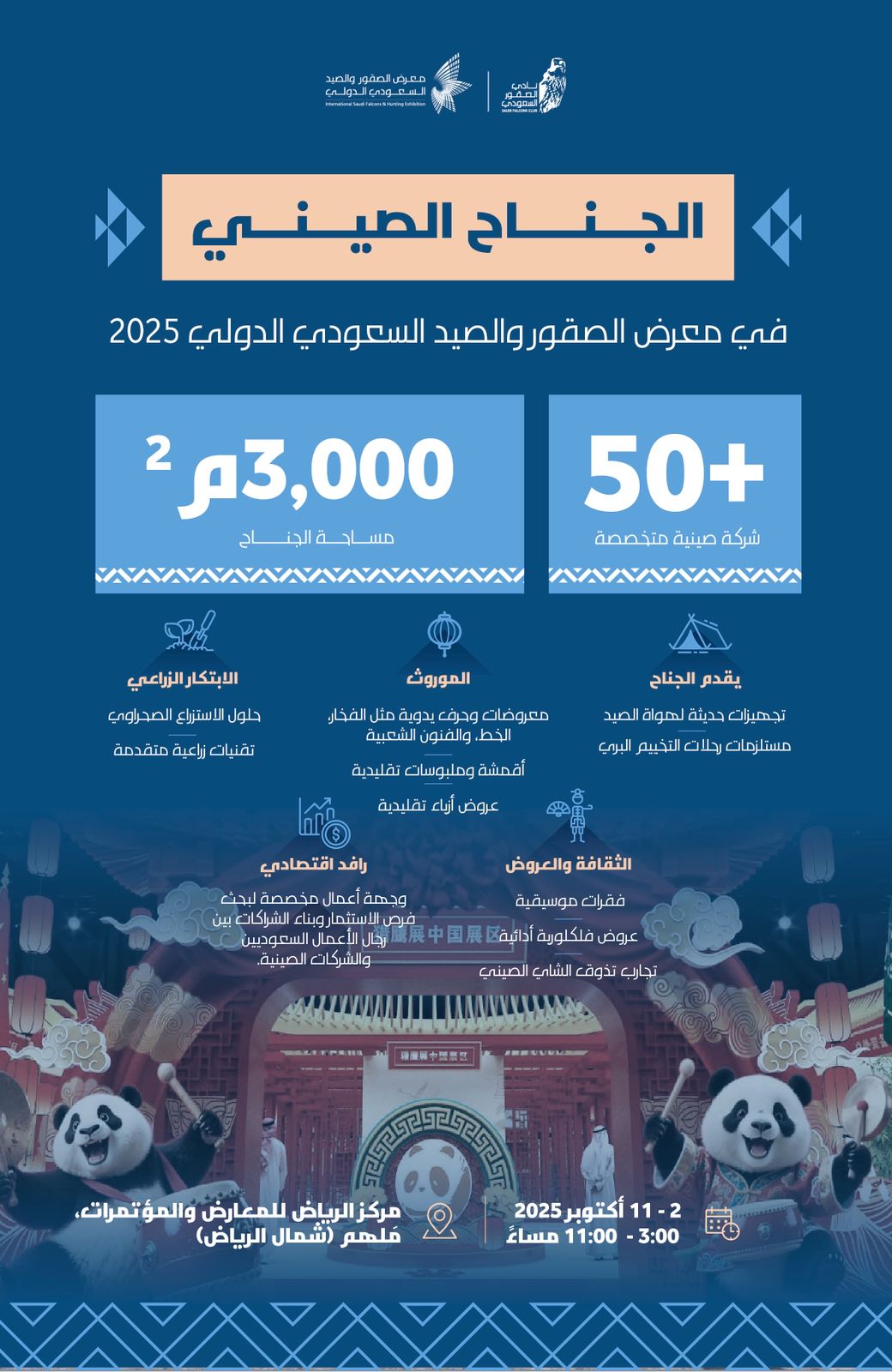ويقدّم الجناح الصيني منظومة متكاملة من الخدمات على مساحة (3000) متر مربع، تشمل حلول الاستزراع الصحراوي والتقنيات الزراعية المتقدمة التي تواكب مستهدفات المملكة في مجال الاستدامة، إضافة إلى تجهيزات حديثة مخصصة لهواة الصيد ورحلات التخييم البري والطائرات من دون طيار والأطعمة الصينية.