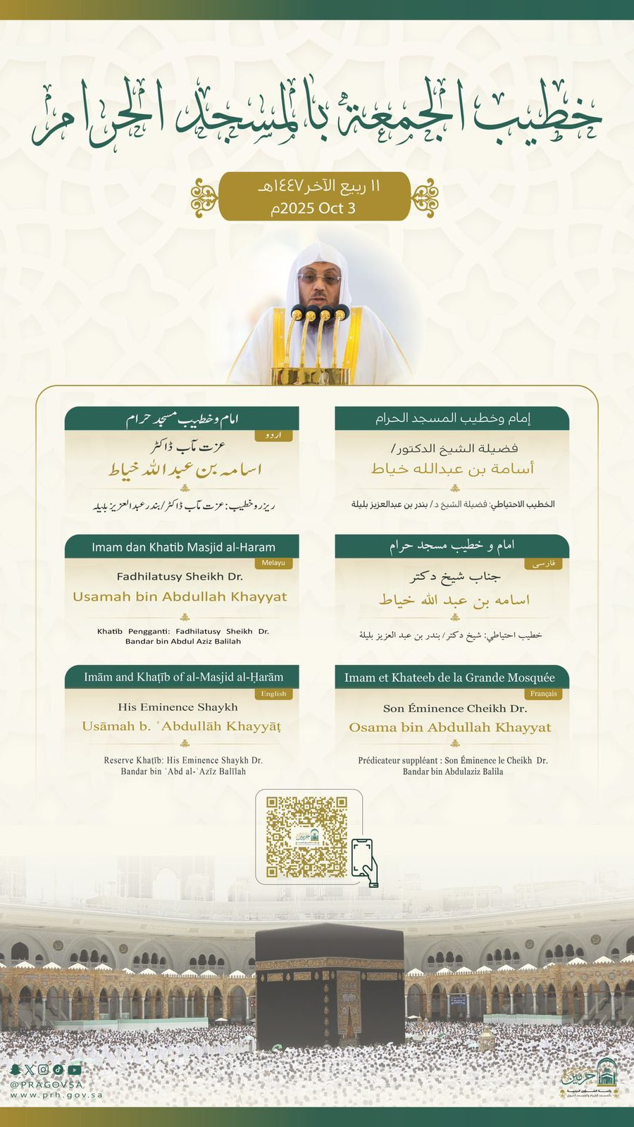 وسيتولى فضيلة الشيخ الدكتور أسامة بن عبدالله خياط .