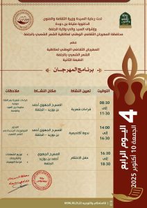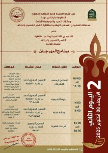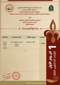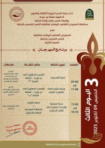 تعيش ولاية الجلفة هذه الأيام على وقع حراك ثقافي استثنائي، مع انطلاق فعاليات الطبعة الثانية من المهرجان الوطني الثقافي لعكّاظية الشعر الشعبي، المنظم تحت الرعاية السامية للسيدة وزيرة الثقافة والفنون، وبـ إشراف السيد والي ولاية الجلفة، محافظة المهرجان الوطني الثقافي لعكّاظية الشعر الشعبي، في الفترة الممتدة من 07 إلى 10 أكتوبر 2025، على خشبة المسرح الجهوي أحمد بن بوزيد.