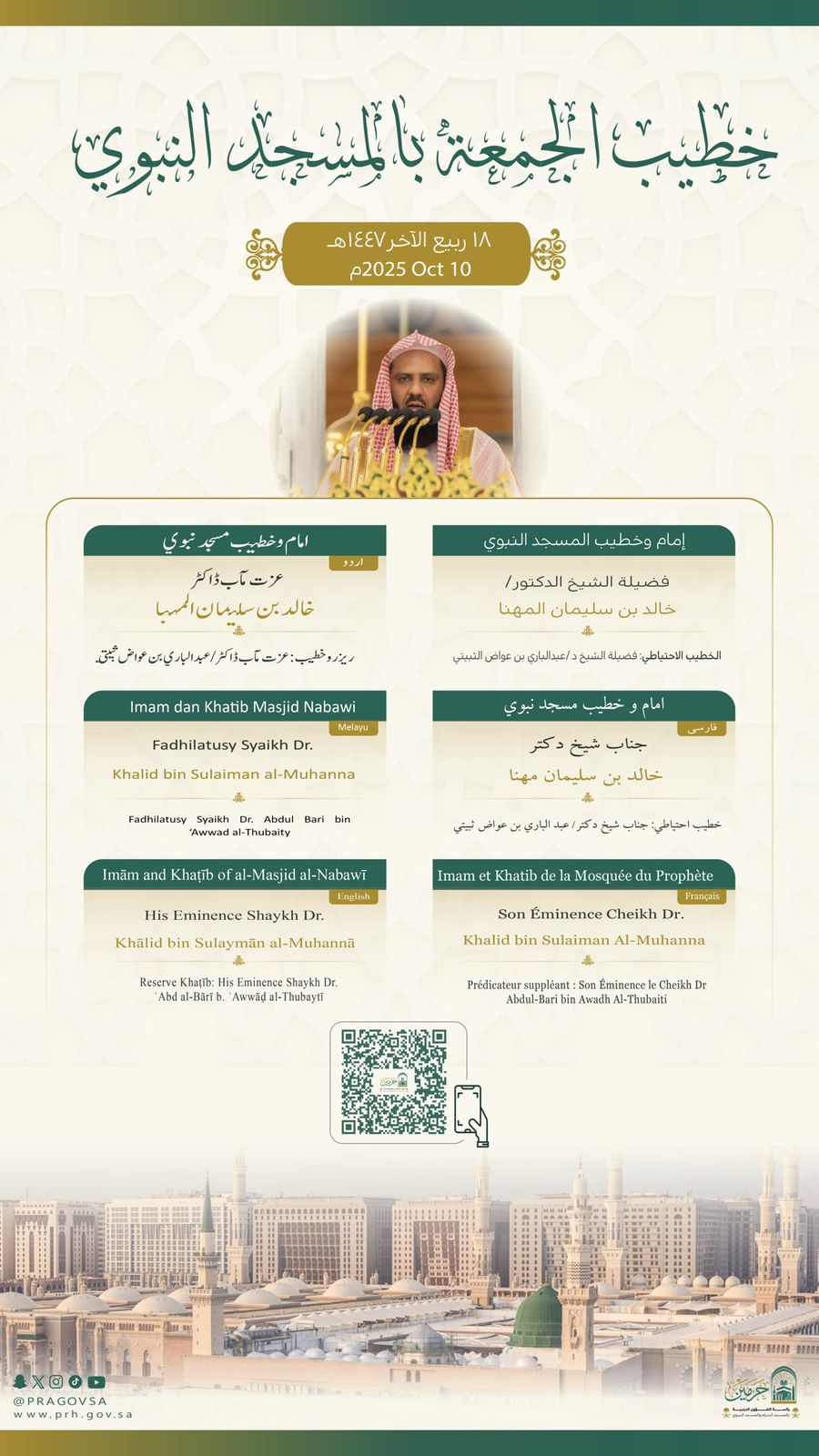 فيما يخطب ويؤم المصلين في المسجد النبوي فضيلة الشيخ الدكتور خالد بن سليمان المهنا .