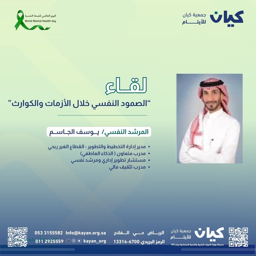 وبالتزامن مع اليوم العالمي للصحة النفسية، فعّلت جمعية كيان ممثلة بالقسم النفسي هذا اليوم بلقاء توعوي بعنوان “الصمود النفسي خلال الأزمات والكوارث”، قدمه المرشد النفسي الأستاذ يوسف الجاسم “عن بُعد”، بإشراف الأخصائية النفسية ريم البليخي، وبحضور الأستاذة سمها الغامدي رئيس مجلس الإدارة، والدكتورة وفاء الصالح عضو مجلس الإدارة، والأستاذة ندى القنيبط المديرة التنفيذية، إضافة إلى موظفات الجمعية ومستفيدات كيان من الأيتام.