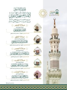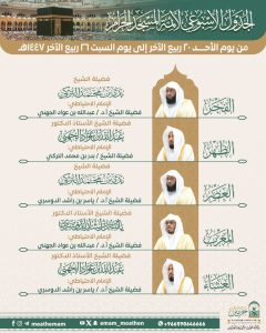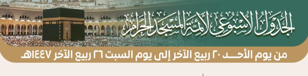حددت رئاسة الشؤون الدينية بالحرمين الشريفين الجدول الأسبوعي لأئمة المسجد الحرام والمسجد النبوي من يوم غد الأحد ٢٠ ربيع الآخر إلى يوم السبت القادم ٢٦ ربيع الآخر ١٤٤٧هـ.