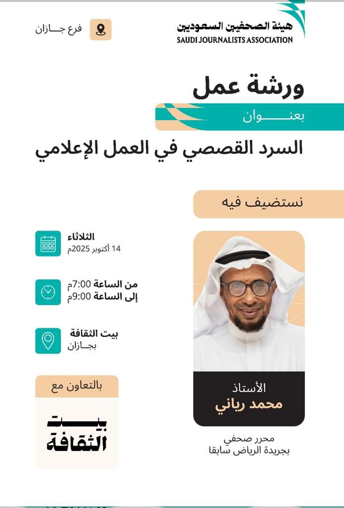 يستضيف فرع هيئة الصحفيين السعوديين بجازان بالتعاون مع بيت الثقافة ورشة عمل الأديب والكاتب القصصي الأستاذ محمد رياني،