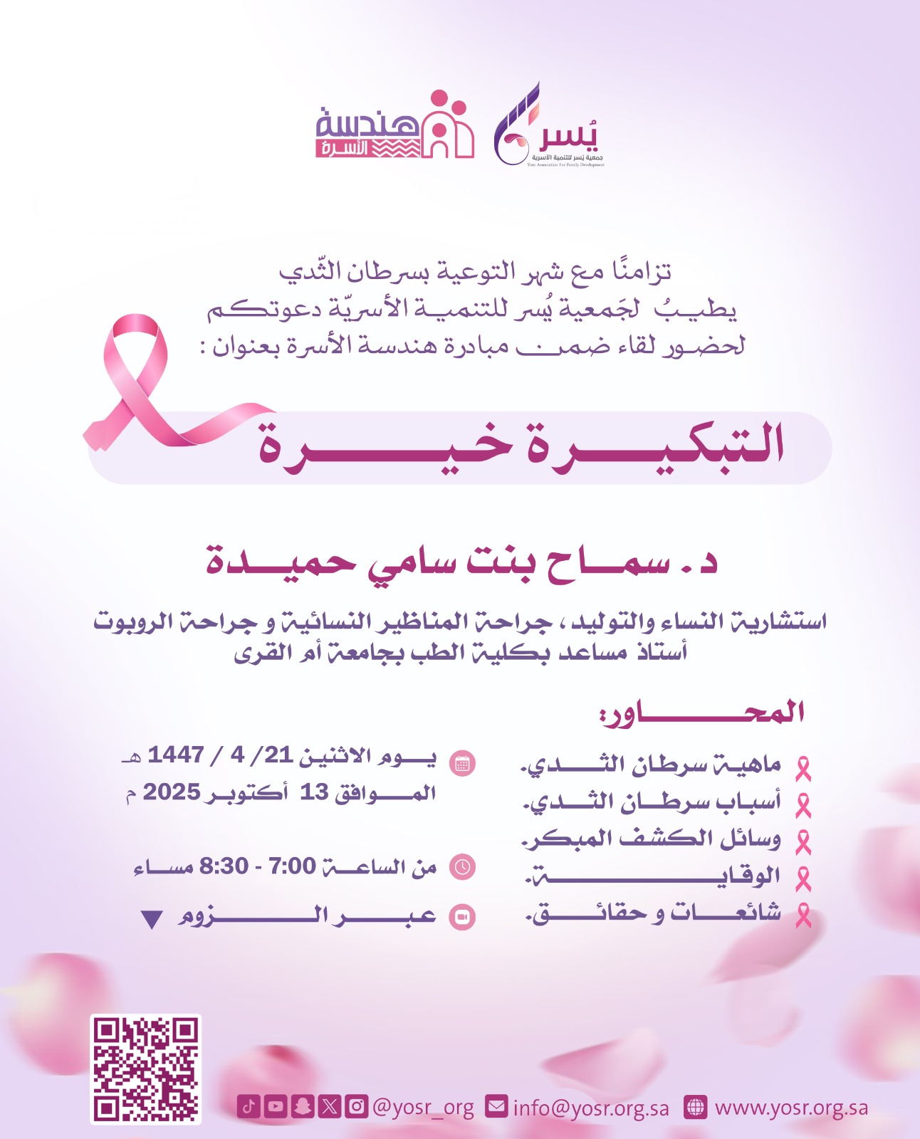 تنظم َجمعية يُسر للتنمية الأسريّة بمكة المكرمة لقاء ضمن مبادرة هندسة الأسرة بعنوان :