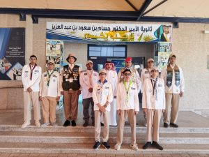 مدير ثانوية الأمير حسام بن سعود بالمندق الأستاذ محمد علي والقائد الكشفي الأستاذ علي جمعان والفريق الكشفي بثانوية الأمير حسام بمناسبة حصول الفريق الكشفي على الوسام الذهبي والمركز الأول في منافسات رسل السلام لتميز الكشفي على مستوى المملكة بمحافظة الطائف.