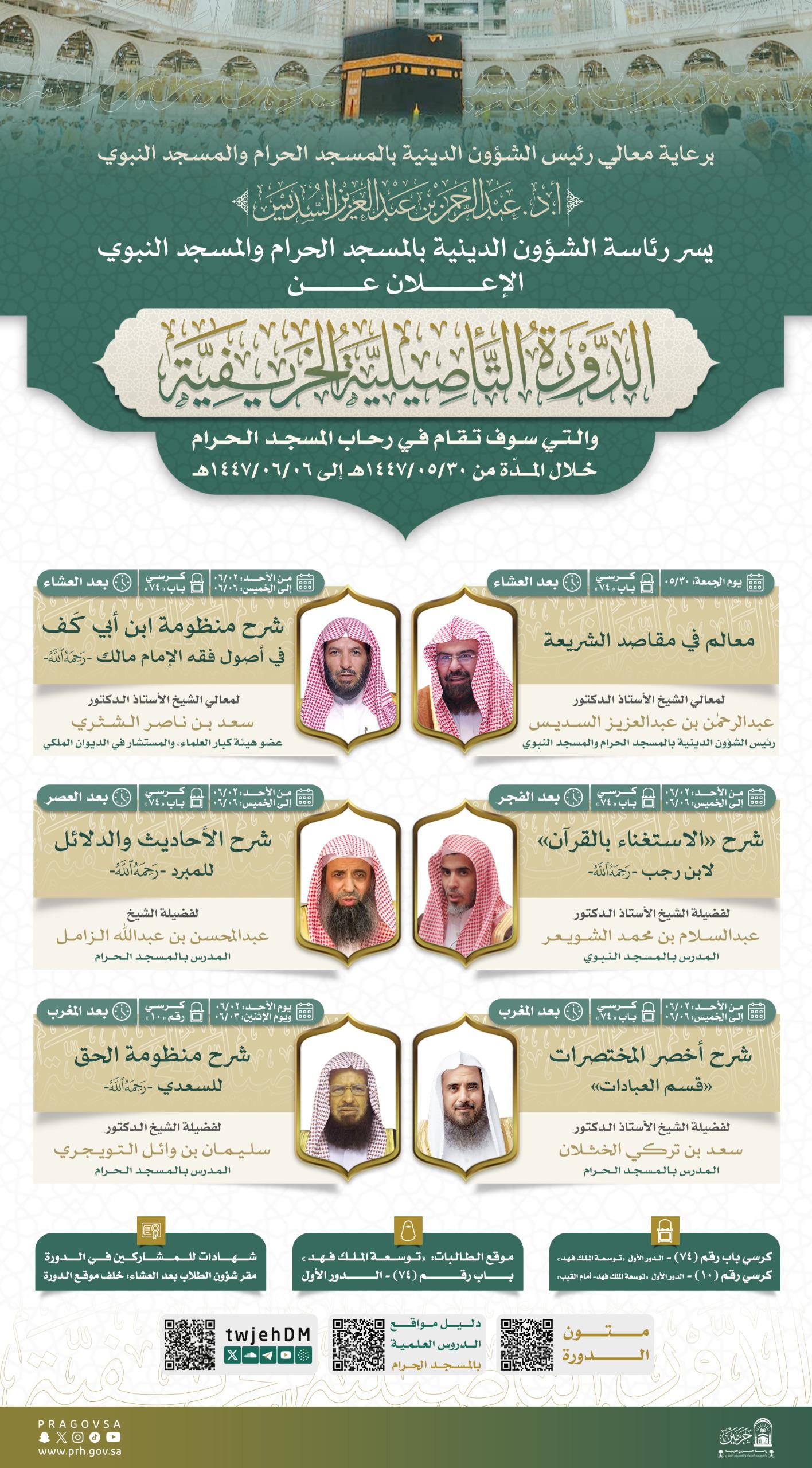 ويشارك في الدورة نخبة من أصحاب المعالي والفضيلة ومدرسي الحرمين الشريفين، وتأتي هذه الدورة برعاية معالي رئيس الشؤون الدينية بالمسجد الحرام والمسجد النبوي الشيخ الأستاذ الدكتور عبدالرحمن بن عبدالعزيز السديس، تأكيدًا لاهتمام الرئاسة بتعزيز البرامج العلمية وتحقيق رسالتها في خدمة العلم الشرعي.