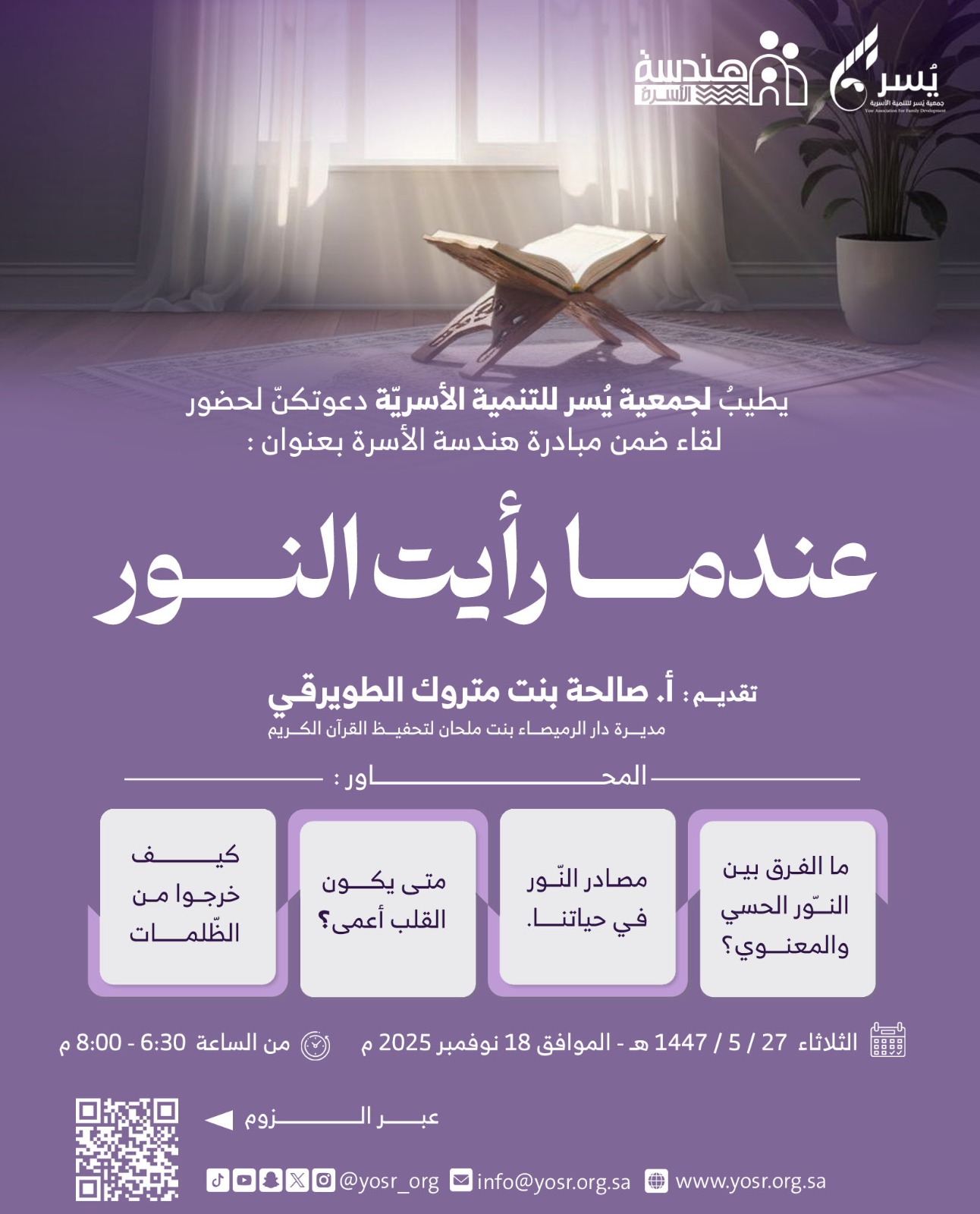 ضمن الأنشطة والبرامج والفعاليات والمبادرات التي تقوم بها جمعية يسر للتنمية الأسرية بمكة المكرمة وضمن مبادرة هندسة الاسرة تقيم الجمعية لقاء بعنوان ( عندما رأيت النور )
