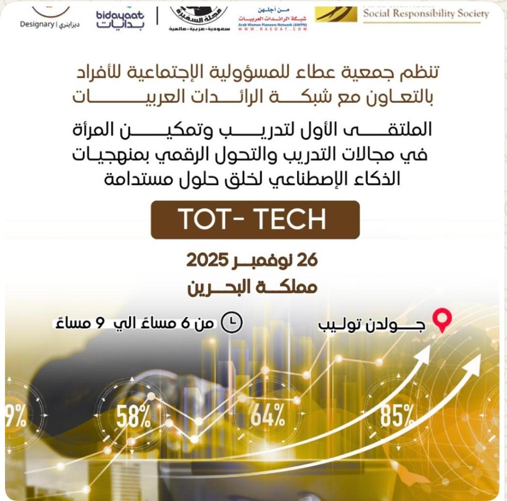 انطلقت اليوم فعاليات الملتقى الأول للتدريب وتمكين المرأة في مجالات التدريب، التحول الرقمي، وتطبيقات الذكاء الاصطناعي، والذي تنظمه جمعية عطاء للمسؤولية الاجتماعية للأفراد بالتعاون مع شبكة الرائدات العربيات، وبإشراف كل من شركة بدايات لتنظيم الفعاليات والمؤتمرات و شركة ديزاينري لخدمات التسويق والتكنولوجيا، وذلك في مملكة البحرين بتاريخ 26 نوفمبر 2025.