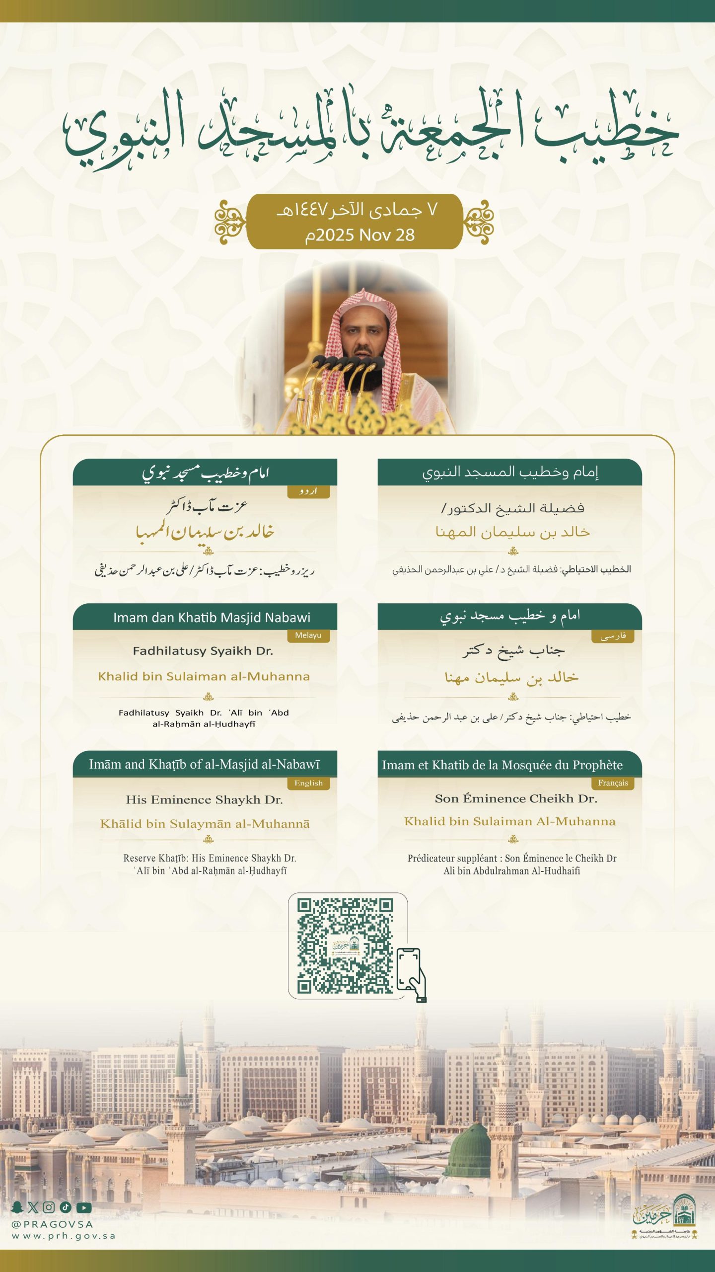 فيما يخطب ويؤم المصلين في المسجد النبوي فضيلة الشيخ الدكتور خالد المهنا.
