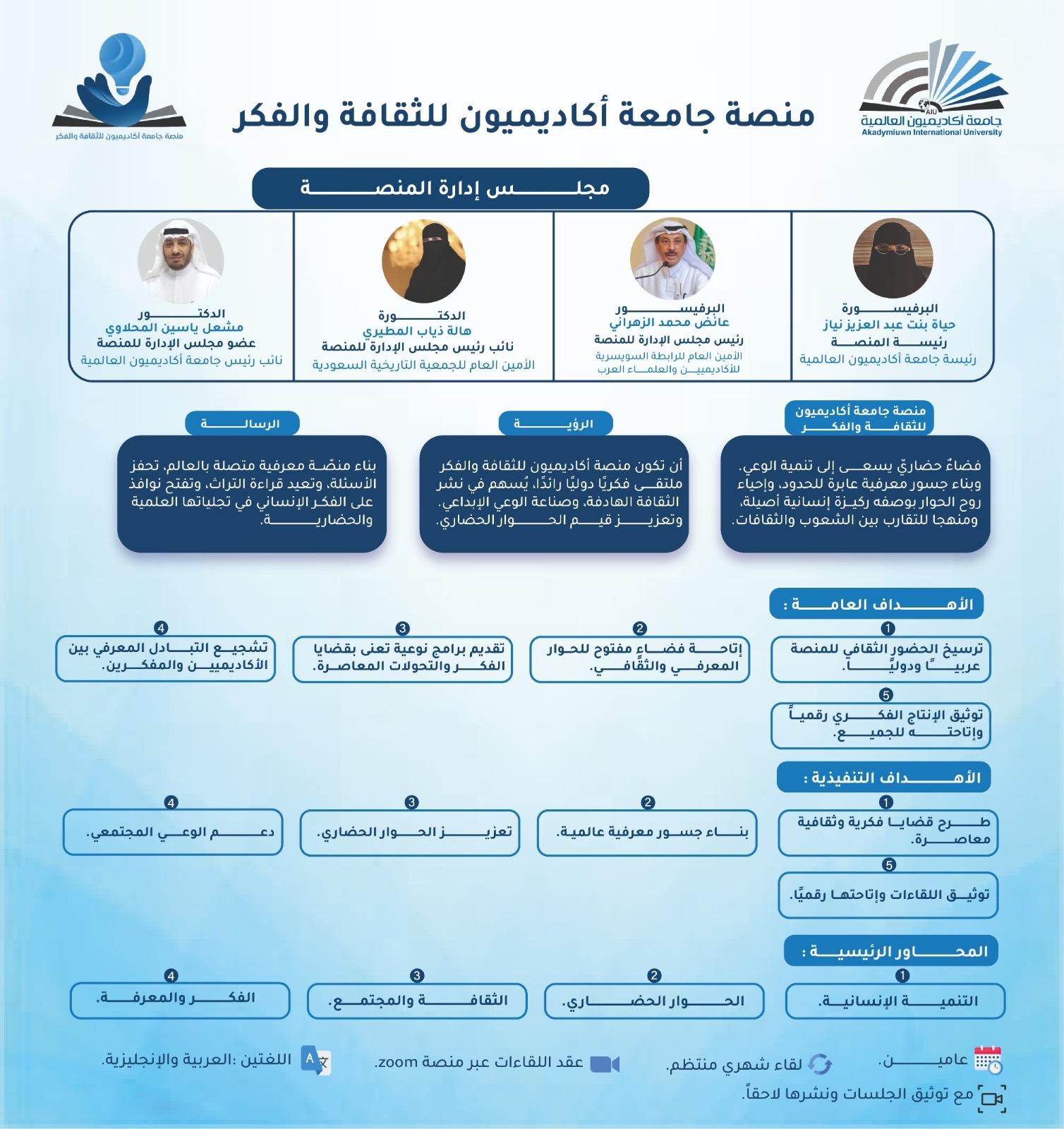 الجدير بالذكر إلى انه ترتكز رؤية المنصّة على تعزيز الحوار الحضاري، ودعم الوعي المجتمعي، وبناء جسور معرفية عالمية، من خلال لقاءات علمية شهرية تُعقد افتراضيًا وتُنشر لاحقًا باللغتين العربية والإنجليزية، بما يضمن وصول المعرفة إلى أوسع شريحة ممكنة من المتابعين والمهتمين