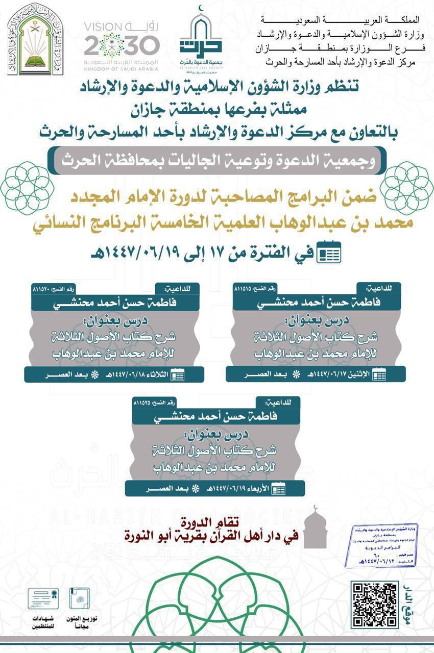 وفي الجانب النسائي، يُنفّذ المركز دروسًا علمية ابتداءً من يوم السبت السابع عشر من الشهر الجاري ولمدة ثلاثة أيام، تتناول شرح كتاب الأصول الثلاثة، وذلك في دار أهل القرآن بقرية أبو النورة.