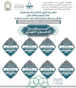 تواصل وزارةُ الشؤون الإسلامية والدعوة والإرشاد، ممثلةً بفرعها في منطقة جازان، تنفيذ البرنامج الدعوي الشهري الذي يُنظّمه مركز الدعوة والإرشاد بمحافظتَي أحد المسارحة والحرث، بالتعاون مع جمعيتي الدعوة والإرشاد وتوعية الجاليات، وذلك مساء الأحد الخامس والعشرين من جمادى الآخرة 1447هـ، في عدد من الجوامع والمساجد بالمحافظتين.