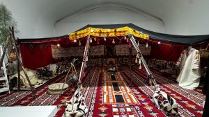 ويبرز في الجناح المسار التخيلي الذي يربط بين الحاضر والماضي، حيث يرافق الزوار جملان بلونين مختلفين، يجسد كل منهما جانبًا من تاريخ المنطقة وتراثها، ليعيش الزائر تجربة غنية وممتعة.