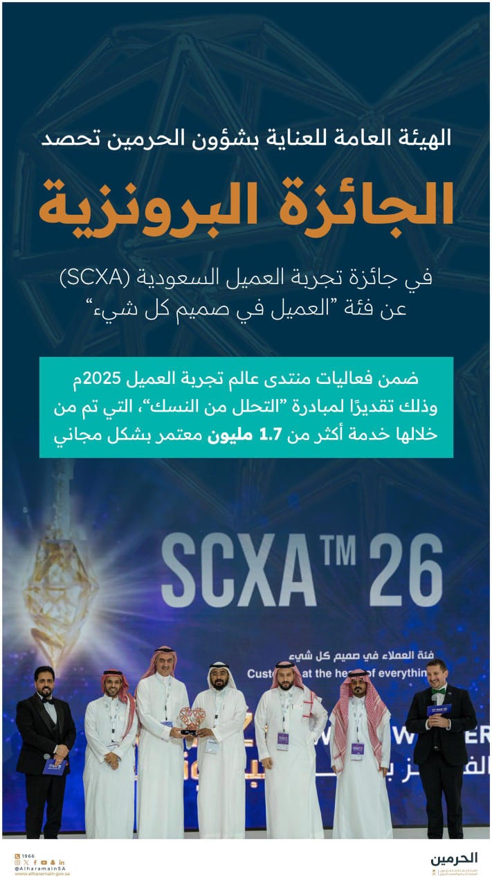 حصدت الهيئة العامة للعناية بشؤون المسجد الحرام والمسجد النبوي الشريف على الجائزة البرونزية في جائزة تجربة العميل السعودية، عن مبادرة “التحلّل من النسك” التي خدمت 1.7 مليون معتمر مجانًا.