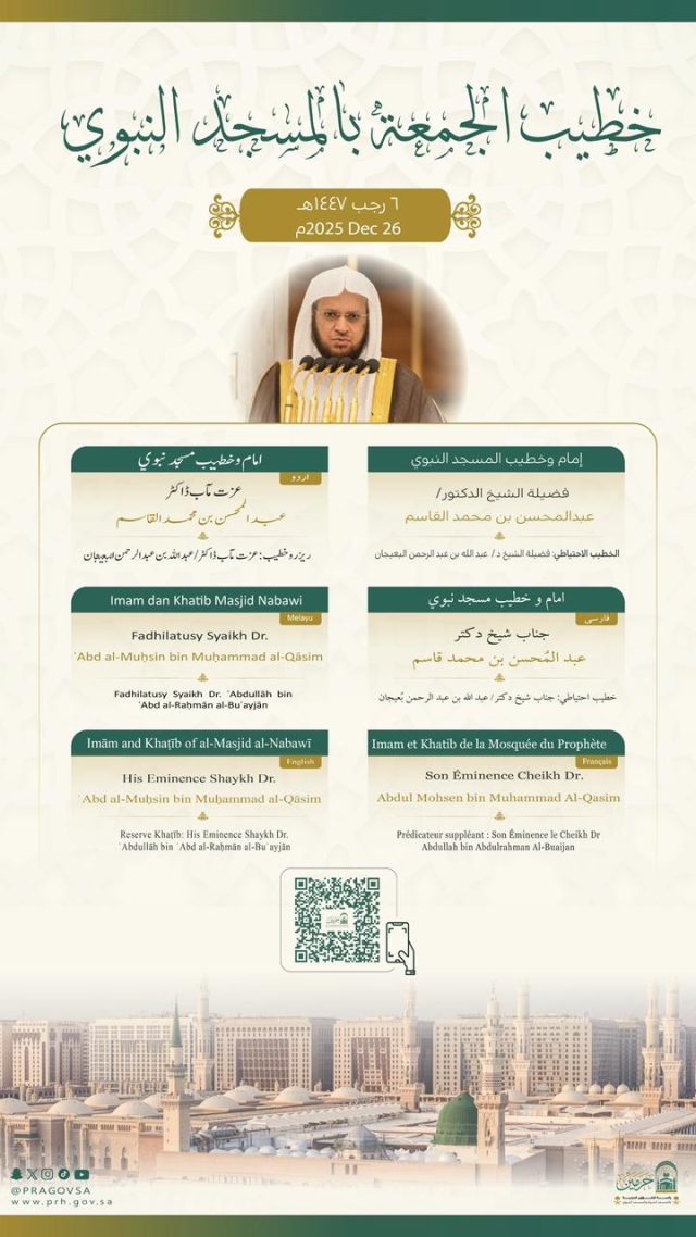 فيما يخطب ويؤم المصلين في المسجد النبوي فضيلة الشيخ الدكتور عبدالمحسن القاسم