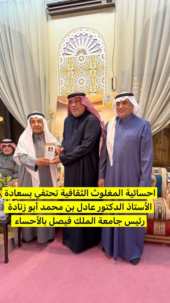 رعى الشيخ عبدالعزيز بن داود المغلوث، عميد أسرة المغلوث، حفل تكريم سعادة الأستاذ الدكتور عادل بن محمد أبو زنادة، رئيس جامعة الملك فيصل بالأحساء، والذي أقيم تحت إشراف أحسائية المغلوث الثقافية في مزرعة المغلوث الأحمدية.