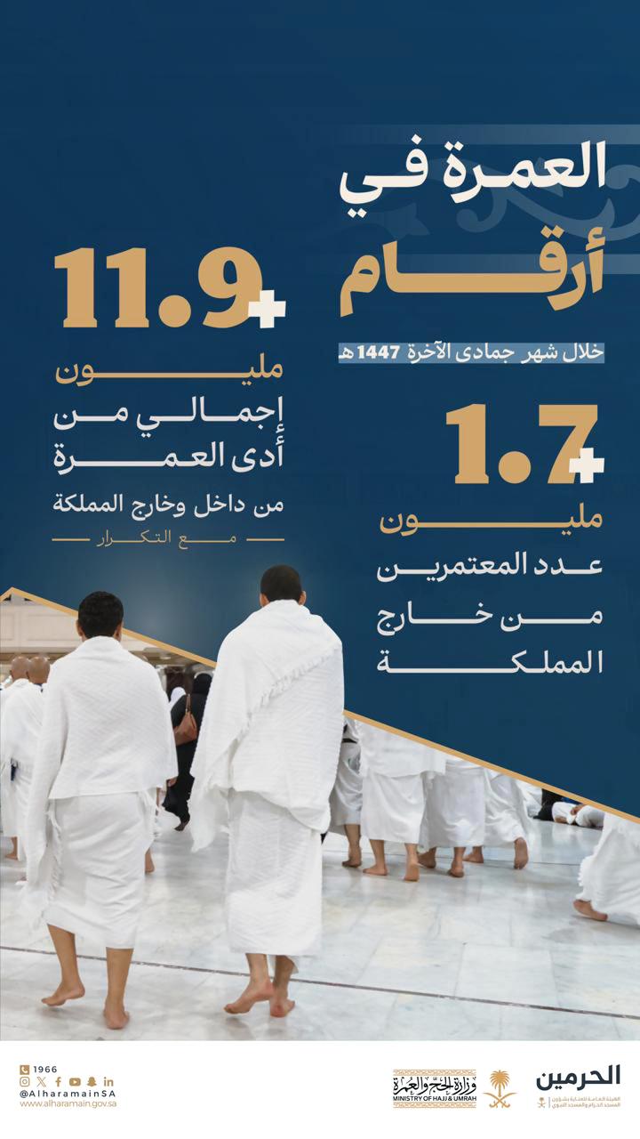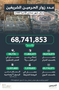 رصدت الهيئة العامة للعناية بشؤون المسجد الحرام والمسجد النبوي الشريف أعداد الزوار والمعتمرين خلال شهر جمادى الآخرة للعام الحالي 1447 هجرية