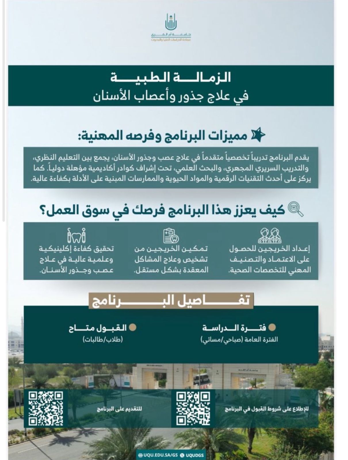 انطلاقًا من دور عمادة الدراسات العليا والبحوث بجامعة أمّ القرى في تطوير البرامج التخصصية النوعية، وتعزيز كفاءة الممارسين الصحيين وفق معايير علمية ومهنية متقدمة؛ أعلنت العمادة عن إتاحة التقديم على برامج الزمالة الطبية بكلية طب الأسنان، المنفَّذة بإشراف كوادر أكاديمية وبحثية مؤهلة، وبمحتوى تدريبي سريري يواكب الممارسات الحديثة في مجال طب الأسنان.