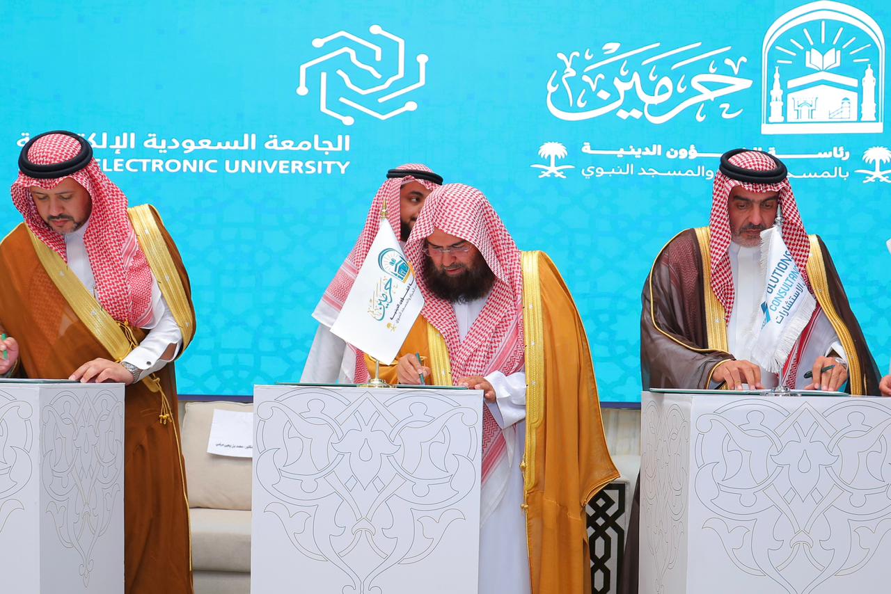 تم توقيع اتفاقية تعاون ثلاثية بين رئاسة الشؤون الدينية بالمسجد الحرام والمسجد النبوي الشريف والجامعة السعودية الإلكترونية وحلول الاستشارية لتطوير مقترح «منصة الحرمين لعلوم الوحيين»