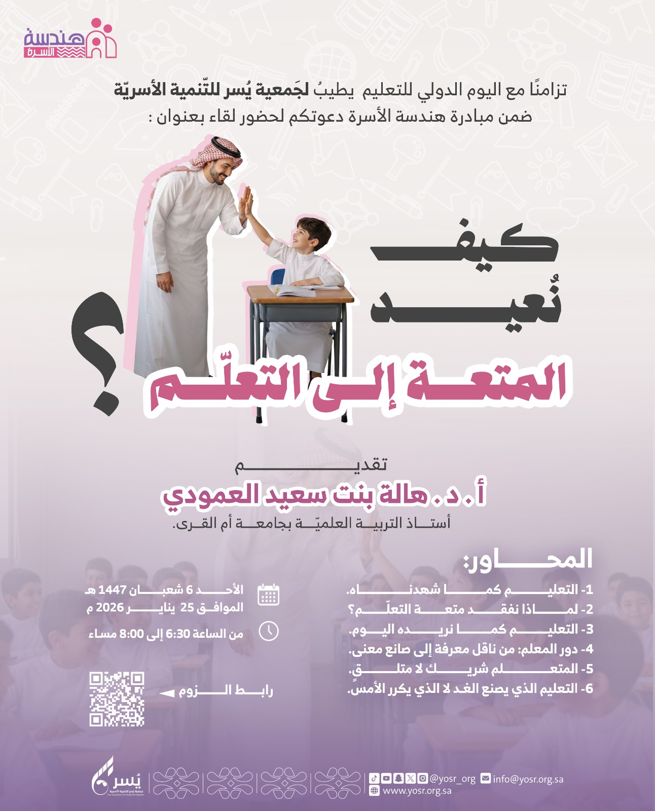 تزامنًا مع اليوم الدولي للتعليم تقيم جمعية يسر للتنمية الأسرية بمكة المكرمة لقاء ضمن مبادرة هندسة الاسرة اللقاء بعنوان (كيف نُعيد المتعة إلى التعلّم).