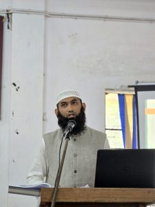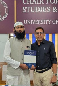 وقام بمناقشة الأطروحة الدكتور محمد بشير، أستاذ قسم اللغة العربية بجامعة آسام بصفته الممتحن الخارجي، حيث أشاد بأصالة البحث ودقته المنهجية، وأدار نقاشًا علميًا معمقًا مع الباحث.