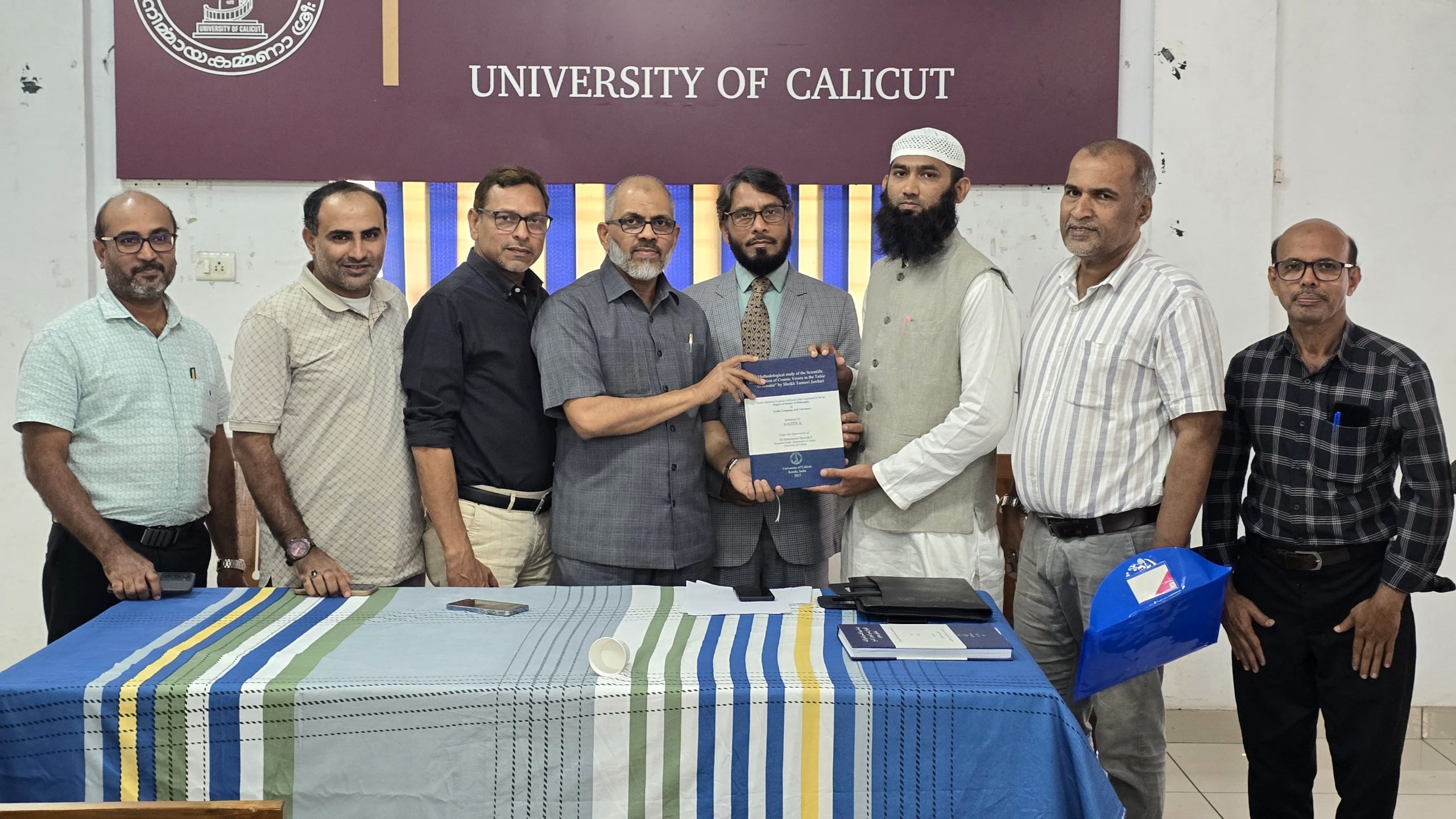 وقد أُنجزت الأطروحة تحت إشراف الدكتور محمد حنيفة، المشرف الأكاديمي بقسم اللغة العربية بجامعة كاليكوت، الذي كان له دور بارز في توجيه الباحث ومتابعة مراحل إعداد البحث، وترأس الجلسة الدكتور عبد المجيد، رئيس قسم اللغة العربية بجامعة كاليكوت.