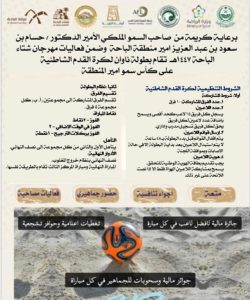 حفظه الله ورعاه أمير منطقة الباحة وضمن فعاليات مهرجان شتاء منطقة الباحة ١٤٤٧هـ تقام يوم الجمعة القادم الموافق ١٤٤٧/٨/١١ بطولة ناوان لكرة القدم الشاطئية على كأس سمو أمير المنطقة.