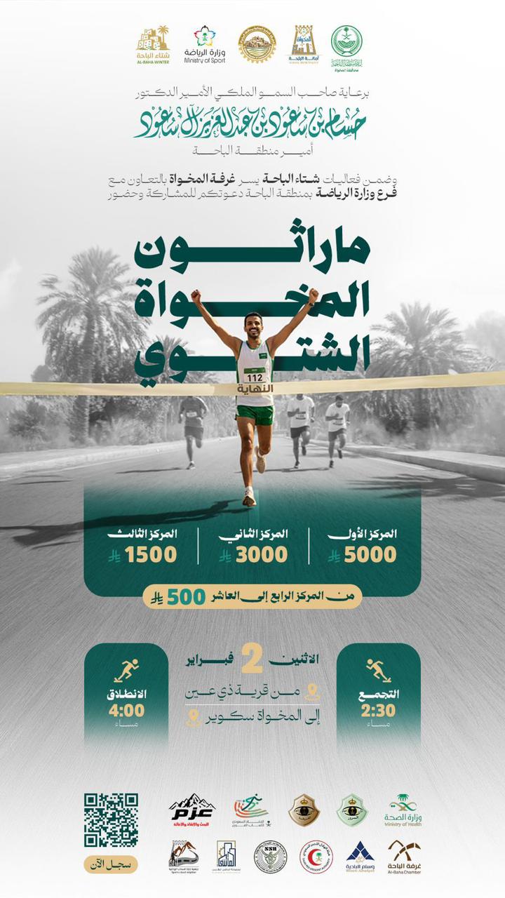 تنطلق يوم الاثنين القادم 2 فبراير فعاليات ماراثون المخواة الشتوي برعاية صاحب السمو الملكي الأمير الدكتور حسام بن سعود بن عبدالعزيز أمير منطقة الباحة، ضمن برامج شتاء الباحة، وتنظيم غرفة المخواة وبالتعاون مع فرع وزارة الرياضة.