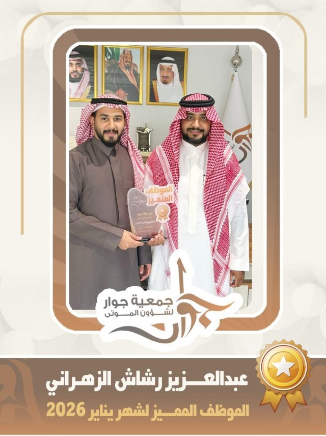 كرّمت جمعية جوار لشؤون الموتى الأستاذ عبدالعزيز رشاش الزهراني بمنحه جائزة الموظف المميز لشهر يناير 2026م، تقديرًا لجهوده المخلصة وتميّزه في أداء مهامه، وما قدمه من عطاء أسهم في تطوير العمل والارتقاء بخدمات الجمعية.